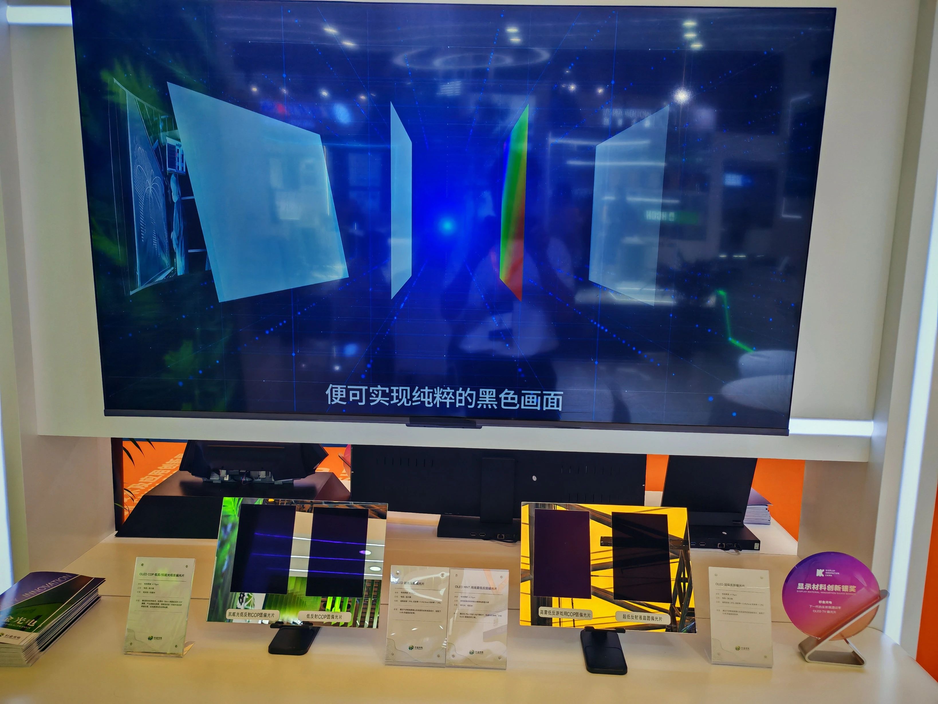 在OLED偏光片方面,本次也展出了適用于大尺寸和中小尺寸兩種應用場景的偏光片產品,已實現從技術突破到規模化供應的跨越。目前,公司已實現OLED TV全尺寸偏光片的穩定量產,全球市場份額突破50%。通過開發高透過、超低反射、護眼型及超薄型等創新產品,杉金光電助力OLED顯示實現色彩表現與功能特性的雙重升級。其中,獨家研發的下一代抗反射高透過率OLED TV偏光片斬獲"顯示材料創新銀獎"。該產品采用突破性抗反射與高透過技術,透光率較上一代提升15%,反射率降低至0.3%以下,并實現柔性化設計,為OLED畫質升級提供核心支撐。